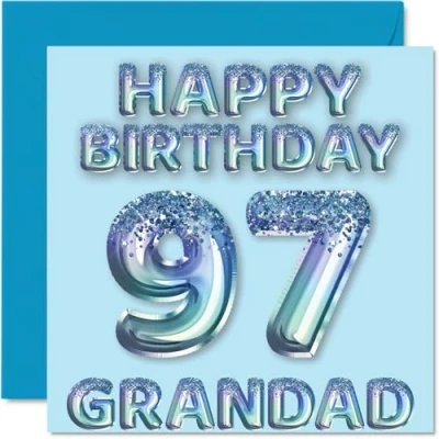 97th Birthday Card for Grandad Blue Glitter Party Balloons Happy Cards 97 Year Old from Grandson Granddaughter, 145mm x Bday Greeting Gift