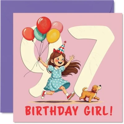 97th Birthday Cards for Women Balloon Girl Happy Card 97 Year Old Woman Nan Wife Granny Nanny, 145mm Bday Greeting