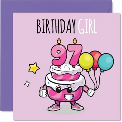 97th Birthday Cards for Women Cake Girl Balloons Happy Card 97 Year Old Woman Nan Auntie Nanny Grandma, 145mm Bday Greeting