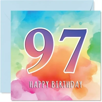 97th Birthday Cards for Women Men Colourful Watercolour Age Happy Card 97 Year Old Woman Man Nanny Grandad Nan Grandma, 145mm Bday Greeting