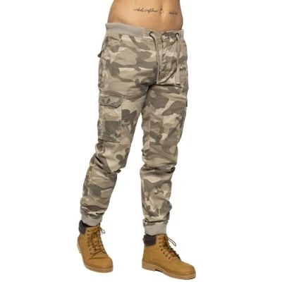 989Zé ENZO Mens Camo Cargo Combat Cuffed Jogger Style Trousers 6 Pockets including velcro side pockets and buttoned back pockets Available in 3 colours: Grey, Beige and Khaki Mid Rise, Zip Fly Fastening, Elasticated Ribbed Waist and Cuffs Great for casual wear or as work pants, go with all types of footwear