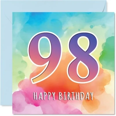 98th Birthday Cards for Men Women Colourful Watercolour Age Happy Card 98 Year Old Man Woman Grandad Auntie Nanny Nan, 145mm Bday Greeting