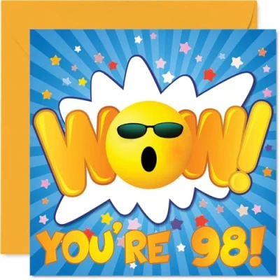 MAKE THEM SMILE WITH THIS UNIQUE BIRTHDAY CARD: This exceptional quality birthday card for him or her shows the design 'WOW Youre 98'. If you are looking for special birthday greetings cards for Men birthday card then then this happy birthday card is bound to make them smile. Not just for birthday gifts for Men this could also be for Nan, Nanny, Grandad, Auntie, Uncle, Wife, Husband or Dad. WHAT DO YOU GET: The cards are printed on both sides with the inside print saying '0' and ample space for your own personal message. The unique fun design is printed on a specially sourced and environmentally responsible board. At 360 microns thick the natural white one-sided gloss board has a quality look and feel. Supplied with a coloured gummed envelope to complement the design and ready to be sealed and sent in the post. NO INK SMUDGES: There is nothing worse than writing inside a card to find that the shiny surface makes the ink smudge. This is why we use a high quality one sided coated board. The uncoated side will absorb more of the ink from your pen to make smudging a thing of the past. 98th Birthday card for Grandad, 98th Birthday card for Auntie, 98th Birthday card for Uncle. SIZES: Greeting Card = 145mm x 145mm, Envelope = 155mm x 155mm, Card Thickness = 360 micron. Wife 98th birthday card, birthday cards for Husband, special birthday cards for Dad, 98th birthday card Nan, Nanny 98th birthday card. MADE AND QUALITY CHECKED IN THE UK: We print and manufacture all our products right here in the UK so you can be sure of a fast turnaround and a product that is expertly made. Using environmentally responsible premium board our card is conscious of the responsible management of the world's forests - perfect birthday cards for Men, fun birthday cards for him, Nanny 98th birthday cards, female birthday cards.