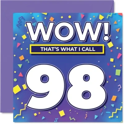 MAKE THEM SMILE WITH THIS UNIQUE BIRTHDAY CARD: This exceptional quality birthday card for him or her shows the design 'Wow! That?s What I Call 98'. If you are looking for special birthday greetings cards for Men birthday card then then this happy birthday card is bound to make them smile. Not just for birthday gifts for Men this could also be for Nan, Nanny, Grandad, Auntie, Uncle, Wife, Husband or Dad. WHAT DO YOU GET: The card is printed on one side and BLANK ON THE INSIDE to allow you to write your very own message. The unique fun design is printed on a specially sourced and environmentally responsible board. At 360 microns thick the natural white one-sided gloss board has a quality look and feel. Supplied with a coloured gummed envelope to complement the design and ready to be sealed and sent in the post. Great Nan birthday cards, Nanny birthday card. DESIGNED FOR WRITING: There is nothing worse than writing inside a card to find that the shiny surface makes the ink smudge. This is why we use a high quality one sided coated board. The uncoated side will absorb more of the ink from your pen to make smudging a thing of the past. 98th Birthday card for Grandad, 98th Birthday card for Auntie, 98th Birthday card for Uncle. SIZES: Greeting Card = 145mm x 145mm, Envelope = 155mm x 155mm, Card Thickness = 360 micron. Wife 98th birthday card, birthday cards for Husband, special birthday cards for Dad, 98th birthday card Nan, Nanny 98th birthday card. MADE AND QUALITY CHECKED IN THE UK: We print and manufacture all our products right here in the UK so you can be sure of a fast turnaround and a product that is expertly made. Using environmentally responsible premium board our card is conscious of the responsible management of the world's forests - perfect birthday cards for Men, fun birthday cards for him, Nanny 98th birthday cards, female birthday cards.