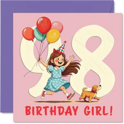98th Birthday Cards for Women Balloon Girl Happy Card 98 Year Old Woman Wife Gran Nan Granny, 145mm Bday Greeting
