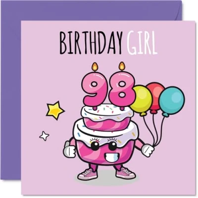 MAKE HER SMILE WITH THIS UNIQUE BIRTHDAY CARD: This exceptional quality birthday card for her shows the design 'Birthday Girl 98'. If you are looking for special birthday greetings cards for Women birthday card then then this happy birthday card is bound to make her smile. Not just for birthday gifts for Women this could also be for Nanny, Nan, Auntie, Nana, Wife, Gran, Granny or Grandma. WHAT DO YOU GET: The card is printed on one side and BLANK ON THE INSIDE to allow you to write your very own message. The unique fun design is printed on a specially sourced and environmentally responsible board. At 360 microns thick the natural white one-sided gloss board has a quality look and feel. Supplied with a coloured gummed envelope to complement the design and ready to be sealed and sent in the post. Great Nanny birthday cards, 98th birthday card, Nan birthday card. NO INK SMUDGES: There is nothing worse than writing inside a card to find that the shiny surface makes the ink smudge. This is why we use a high quality one sided coated board. The uncoated side will absorb more of the ink from your pen to make smudging a thing of the past. 98th Birthday card for Auntie, 98th Birthday card for Nana, 98th Birthday card for Wife. SIZES: Greeting Card = 145mm x 145mm, Envelope = 155mm x 155mm, Card Thickness = 360 micron. Gran 98th birthday card, birthday cards for Granny, cute birthday cards for Grandma, 98th birthday card Nanny, Nan 98th birthday card. MADE AND QUALITY CHECKED IN THE UK: We print and manufacture all our products right here in the UK so you can be sure of a fast turnaround and a product that is expertly made. Using environmentally responsible premium board our card is conscious of the responsible management of the world's forests - perfect birthday cards for Women, fun birthday cards for her, Nan 98th birthday cards, female birthday cards.