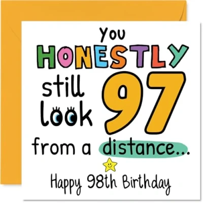 MAKE THEM SMILE WITH THIS UNIQUE BIRTHDAY CARD: This exceptional quality birthday card for him or her shows the design 'You Honestly still look 97 from a distance Happy 98th Birthday'. If you are looking for special birthday greetings cards for Men birthday card then then this happy birthday card is bound to make them smile. Not just for birthday gifts for Men this could also be for Auntie, Nanny, Nan, Uncle, Dad, Wife, Grandma or Husband. WHAT DO YOU GET: The card is printed on one side and BLANK ON THE INSIDE to allow you to write your very own message. The unique fun design is printed on a specially sourced and environmentally responsible board. At 360 microns thick the natural white one-sided gloss board has a quality look and feel. Supplied with a coloured gummed envelope to complement the design and ready to be sealed and sent in the post. Great Auntie birthday cards, Nanny birthday card. NO INK SMUDGES: There is nothing worse than writing inside a card to find that the shiny surface makes the ink smudge. This is why we use a high quality one sided coated board. The uncoated side will absorb more of the ink from your pen to make smudging a thing of the past. 98th Birthday card for Nan, 98th Birthday card for Uncle, 98th Birthday card for Dad. SIZES: Greeting Card = 145mm x 145mm, Envelope = 155mm x 155mm, Card Thickness = 360 micron. Wife 98th birthday card, birthday cards for Grandma, special birthday cards for Husband, 98th birthday card Auntie, Nanny 98th birthday card. MADE AND QUALITY CHECKED IN THE UK: We print and manufacture all our products right here in the UK so you can be sure of a fast turnaround and a product that is expertly made. Using environmentally responsible premium board our card is conscious of the responsible management of the world's forests - perfect birthday cards for Men, fun birthday cards for him, Nanny 98th birthday cards, female birthday cards.