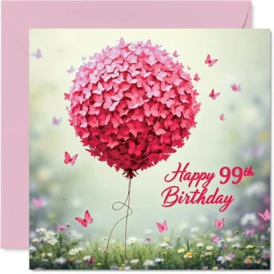 99th Birthday Cards for Women Pink Butterfly Balloon Happy Card 99 Year Old Woman Gran Grandma Wife Nan, 145mm Bday Greeting