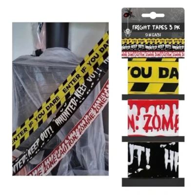 9m Halloween Warning Tape Banner Haunted House Party Decoration Bloody Caution. STRIKING COLOURS: Bold black, yellow, and red colour combinations ensure high visibility and dramatic effect in your Halloween setup 3 Designs - Caution Tape for scene setters DESIGN VARIETY: Features three distinct designs - 'Enter if You Dare', 'Haunted: Keep Out', and 'Zombie Zone Caution' messages Enter if you Dare / Haunted KEEP OUT! / Zombie Zone. VERSATILE USE: Ideal for both indoor and outdoor Halloween decorations, haunted house setups, themed parties, and spooky events PACK CONTENTS: Set of 3 spooky warning tapes measuring 9 metres each, perfect for Halloween parties and haunted house decorations
