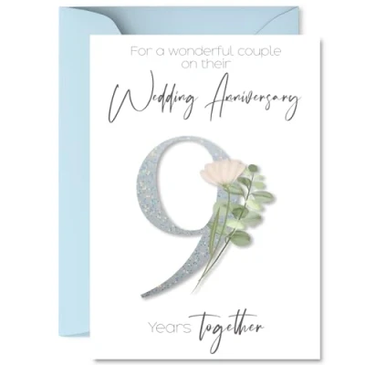 MAKE THEM SMILE WITH THIS ROMANTIC ANNIVERSARY CARD: This exceptional quality anniversary card for her or him shows the design 'For a Wonderful couple on their Wedding Anniversary 9 Years Together'. If you are looking for special anniversary greetings cards for Women anniversary card then then this happy anniversary card is bound to make them smile. Not just for anniversary gifts for Men this could also be for Partner, Wife, Husband, Companion, Boyfriend or Girlfriend. WHAT DO YOU GET: The cards are printed on both sides with the inside print saying 'Have a Lovely Day' and ample space for your own personal message. The unique fun design is printed on a specially sourced and environmentally responsible board. At 360 microns thick the natural white one-sided gloss board has a quality look and feel. Supplied with a coloured gummed envelope to complement the design and ready to be sealed and sent in the post. NO INK SMUDGES: There is nothing worse than writing inside a card to find that the shiny surface makes the ink smudge. This is why we use a high quality one sided coated board. The uncoated side will absorb more of the ink from your pen to make smudging a thing of the past. 9th anniversary card for Husband, 9th anniversary card for Companion, 9th anniversary card for Boyfriend. SIZES: Greeting Card = 148mm x 210mm, Envelope = 150mm x 212mm, Card Thickness = 360 micron. Boyfriend 9th anniversary card, anniversary cards for Husband, cute anniversary cards for Companion, 9th anniversary card Partner, Wife 9th anniversary card. MADE AND QUALITY CHECKED IN THE UK: We print and manufacture all our products right here in the UK so you can be sure of a fast turnaround and a product that is expertly made. Using environmentally responsible premium board our card is conscious of the responsible management of the world's forests - perfect anniversary cards for Men, cute anniversary cards for her, Wife 9th anniversary cards, female anniversary cards.