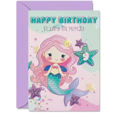 MAKE THEM SMILE WITH THIS FABULOUS GIRLS BIRTHDAY CARD: This exceptional quality birthday card shows a beautiful colourful design of a mermaid with saying 'Happy Birthday Beautiful Little Mermaid 9' on the front and 'Have A Magical Day' on the inside. If you are looking for a wonderful birthday cards, then this vibrant card is bound to make them smile. This could also be for Daughter, Granddaughter, Grandchild, Niece, Cousin, Sister or Goddaughter. WHAT DO YOU GET: The card is printed on one side and BLANK ON THE INSIDE to allow you to write your very own message. The unique fun design is printed on a specially sourced and environmentally responsible board. At 360 microns thick and 300gsm the natural white one-sided gloss board has a quality look and feel. Supplied with a coloured gummed envelope to complement the design and ready to be sealed and sent in the post. Birthday cards for girls. NO INK SMUDGES: There is nothing worse than writing inside a card to find that the shiny surface makes the ink smudge. This is why we use a high quality one sided coated board. The uncoated side will absorb more of the ink from your pen to make smudging a thing of the past. Birthday card niece, female birthday card, girl birthday card, happy birthday cards for her, 9 year old birthday card, birthday card 9 year old girl. SIZES: Greeting Card = 148mm x 210mm, Envelope = 150mm x 212mm, Card Thickness = 360 micron. Great daughter birthday cards from Mum or Dad. Frozen birthday card for girl, kids birthday cards, childrens birthday cards, happy birthday niece card, birthday cards kids, birthday girl card, birthday card girls, 9 year old birthday card girl, happy birthday card. MADE AND QUALITY CHECKED IN THE UK: We print and manufacture all our product right her in the UK so you can be sure of a fast turnaround and a product that is expertly made. Using environmentally responsible premium board our card is conscious of the responsible management of the world's forests. age 9 birthday card, birthday cards for kids, 9 birthday card girl.