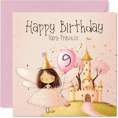 9th Birthday Cards for Girls Pink Fairy Princess Happy Card 9 Year Old Girl Step Daughter Great Niece Cousin, 145mm Bday Greeting