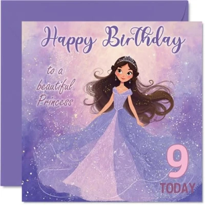 9th Birthday Cards for Girls Princess in Purple Happy Card 9 Year Old Girl Goddaughter Sister Step Daughter Granddaughter, 145mm Bday Greeting