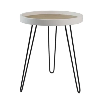 The round wood tray top design provides a unique sense of style while the metal base ensure quality and years of lasting enjoyment. Dimensions:40 dia x 49(H)cm. Material:Made from steel base in black coating and ash veneered top. Features round top with a lipped edge, finish with white and ash veneer, and three hairpin legs ; our decorative side table will add confident style to your space. Assembly required. Please note, as this table has been made from natural material the colour and finish may vary.