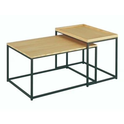The Novani Mixed Material Nesting Coffee Table Set makes a dynamic pair. Scatter the set around a room, or tuck the cocktail under the accent table for a mid-century modern layered look. Dimensions: L 75x55x42.5(H)cm / S 60x40x50.5(H)cm. Oak veneered table tops with boxed style black metal base for support. Self assembly required. End table has tray top is fixed in place but can be used with great functionality. Cocktail table slides under end table for small space living.