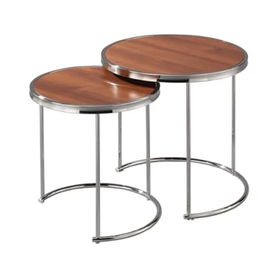 Visio Set of 2 Round Nesting Table-Wooden tops in walnut colour finish,steel base in chrome coating Dimensions: L :50 Dia x 50(H)cm /S :42 Dia x 45(H)cm. Unique design for functionality and style. It includes two nesting tables that work well together or apart. Contemporary Design,Stylish solution to your home requirements. Assembly: Self assembly required. The colour may be slightly different from the picture due to photography light condition.