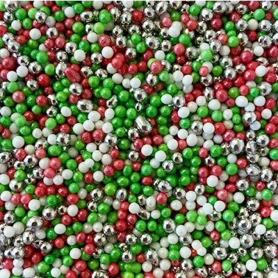 CHRISTMAS THEMED CAKE DECORATIONS - Add some festive inspired 100s and 1000s to your baked goods. This mix includes tiny balls of bright green, red, white and silver 100s and 1000s with a glimmer/shimmer finish. FESTIVE XMAS MIX - This 30g pouch of 100s and 1000s cake decorations contains red, green, white and sparkly silver non pareill sprinkles in seasonal colours, the perfect decoration for any Christmas Eve party, Christmas Day desserts and ice cream. FOR ALL FESTIVITIES - Add a touch of festive cheer to your cakes and birthday celebrations with our festive Christmas cake sprinkles. You can even use these Christmas baking decorations as hot chocolate sprinkles! ADD TO ALL CHRISTMAS TREATS - These exquisite sprinkles are an excellent choice for embellishing yule logs, gingerbread houses, traditional Christmas cakes, Christmas cupcakes, cakes, cookies, Christmas cookie decorations, macarons, biscuits, and doughnuts. HAND PACKAGED IN THE UK - Our UK-based headquarters meticulously hand-packages each 30g pouch of Christmas cupcake decorations, ensuring that every little bag is carefully selected just for you. THE PERFECT AMOUNT - Each 'A Pinch Of' pouch of Xmas cake decorations contains just enough for a single cake or up to 12 cupcakes avoiding the cupboards full of spare sprinkles. DIETARY: Our Twinkle Red, Green and White 100s and 1000s sprinkles are not suitable for Vegetarians. Contain Wheat