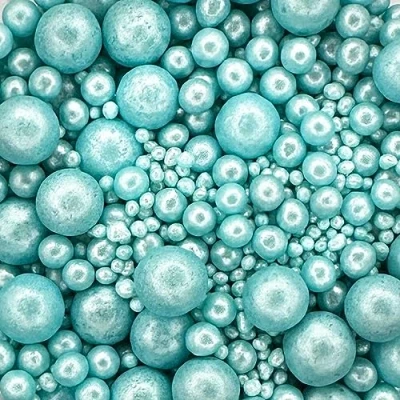 PEARL MIX - A beautiful mix of glimmer turquoise pearls. Create a dramatic encrusted effect on large cakes and sprinkle on cupcakes for a decadent decoration. MIXED SIZES - This 70g pouch includes various-sized sprinkles including 100's and 1000's and 2mm-7mm pearls. ALL OCCASIONS - Perfect for adding a touch of enchantment to your cakes. Perfect for weddings, christenings, anniversaries, baby showers and birthdays. SHIMMERING DESIGN - High shimmer pearls in this lovely mix give a stunning twinkly finish. VERSATILE PRODUCT - These exquisite sprinkles are an excellent choice for embellishing cupcakes, cakes, cookies, macarons, biscuits, and doughnuts. Elevate the allure of your cake drip creations by adding these gorgeous sprinkles as a finishing touch.