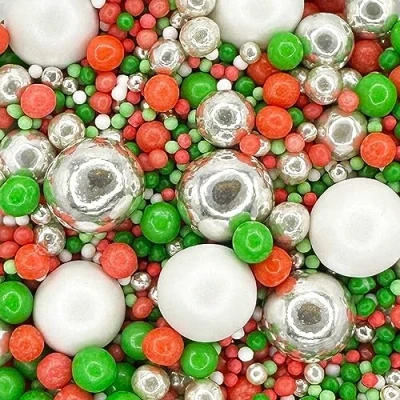 CHRISTMAS THEMED CAKE DECORATIONS - Add some festive-inspired pearls to your baked goods. A beautiful mix of polished and matt pearls, chocoballs and 100s and 1000s in silver, red, green and white. FESTIVE XMAS MIX - This 70g pouch of polished and matt pearls, chocoballs and 100s and 1000s in silver, red, green and white. The different sizes in this mix, create a dramatic encrusted effect on large cakes and sprinkle on cupcakes, making it the perfect decoration for any Christmas Eve party, Christmas Day desserts and ice cream. FOR ALL FESTIVITIES - Add a touch of festive cheer to your cakes and birthday celebrations with our festive Christmas cake sprinkles. You can even use these Christmas baking decorations as hot chocolate sprinkles! SHIMMERING DESIGN - High shimmer pearls in this lovely mix give a stunning twinkly finish. ADD TO ALL CHRISTMAS TREATS - These exquisite sprinkles are an excellent choice for embellishing yule logs, gingerbread houses, traditional Christmas cakes, Christmas cupcakes, cakes, cookies, Christmas cookie decorations, macarons, biscuits, and doughnuts.