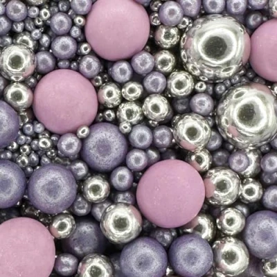 PEARL MIX - A beautiful mix of glimmer Violet and silver pearls and chocoballs. Create a dramatic encrusted effect on large cakes and sprinkle on cupcakes for a decadent decoration. Beautiful Mother's Day sprinkles & Mothers Day cake decorations. MIXED SIZES - This 70g pouch includes various-sized sprinkles including chocoballs, 100's and 1000's and 2mm-7mm pearls. ALL OCCASIONS - Perfect for adding a touch of enchantment to your cakes. Perfect for weddings, christenings, anniversaries, baby showers and birthdays. SHIMMERING DESIGN - High shimmer pearls in this lovely mix give a stunning twinkly finish. VERSATILE PRODUCT - These exquisite sprinkles are an excellent choice for embellishing cupcakes, cakes, cookies, macarons, biscuits, and doughnuts. Elevate the allure of your cake drip creations by adding these gorgeous sprinkles as a finishing touch.