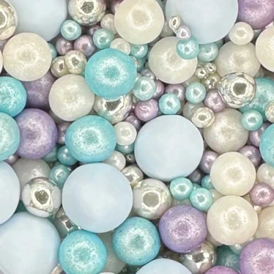 PEARL MIX - glimmer blue, violet, mother of pearl and high shine silver pearls. Create a dramatic encrusted effect on large cakes and sprinkle on cupcakes for a decadent decoration. MIXED SIZES - This 30g pouch includes various sprinkles ranging in size from 2mm 100's and 1000's and pearls to 10mm delicious chocoballs ALL OCCASIONS - Perfect for adding a touch of enchantment to your cakes. Perfect for weddings, christenings, anniversaries, baby showers and birthdays. SHIMMERING DESIGN - High shimmer pearls in this lovely mix give a stunning twinkly finish. VERSATILE PRODUCT - These exquisite sprinkles are an excellent choice for embellishing cupcakes, cakes, cookies, macarons, biscuits, and doughnuts. Elevate the allure of your cake drip creations by adding these gorgeous sprinkles as a finishing touch.