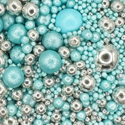 PEARL MIX - A beautiful mix of glimmer turquoise and silver pearls and chocoballs. Create a dramatic encrusted effect on large cakes and sprinkle on cupcakes for a decadent decoration. MIXED SIZES - This 30g pouch includes various-sized sprinkles including chocoballs, 100's and 1000's and 2mm-7mm pearls. ALL OCCASIONS - Perfect for adding a touch of enchantment to your cakes. Perfect for weddings, christenings, anniversaries, baby showers and birthdays. SHIMMERING DESIGN - High shimmer pearls in this lovely mix give a stunning twinkly finish. VERSATILE PRODUCT - These exquisite sprinkles are an excellent choice for embellishing cupcakes, cakes, cookies, macarons, biscuits, and doughnuts. Elevate the allure of your cake drip creations by adding these gorgeous sprinkles as a finishing touch.