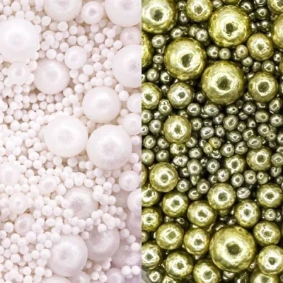 TWO VARIETIES OF PEARLS MIX - Mother of Pearl and high shine gold - A beautiful mix of different sized pearls. Create a dramatic encrusted effect on large cakes and sprinkle on cupcakes for a decadent decoration. MIXED SIZES - 2 x 30g pouches include various-sized sprinkles including 100's and 1000's and 2mm-7mm pearls. BRIDAL THEME - Perfect for adding a touch of enchantment to your cakes. Perfect for weddings, christenings, anniversaries, baby showers and birthdays. SHIMMERING DESIGN - High shimmer pearls in this lovely mix give a stunning twinkly finish. VERSATILE PRODUCT - These exquisite sprinkles are an excellent choice for embellishing cupcakes, cakes, cookies, macarons, biscuits, and doughnuts. Elevate the allure of your cake drip creations by adding these gorgeous sprinkles as a finishing touch.
