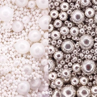 TWO VARIETIES OF PEARLS MIX - Mother of Pearl and high shine silver - A beautiful mix of different sized pearls. Create a dramatic encrusted effect on large cakes and sprinkle on cupcakes for a decadent decoration. MIXED SIZES - 2 x 30g pouches include various-sized sprinkles including 100's and 1000's and 2mm-7mm pearls. BRIDAL THEME - Perfect for adding a touch of enchantment to your cakes. Perfect for weddings, christenings, anniversaries, baby showers and birthdays. SHIMMERING DESIGN - High shimmer white pearls in this lovely mix give a stunning twinkly finish. VERSATILE PRODUCT - These exquisite sprinkles are an excellent choice for embellishing cupcakes, cakes, cookies, macarons, biscuits, and doughnuts. Elevate the allure of your cake drip creations by adding these gorgeous sprinkles as a finishing touch.