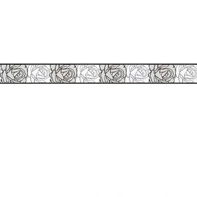 A repeated outlined rose border. Shown here in the monochrome colourway. Self adhesive border - please request sample for true colour and texture. Pattern repeat is 13cm.