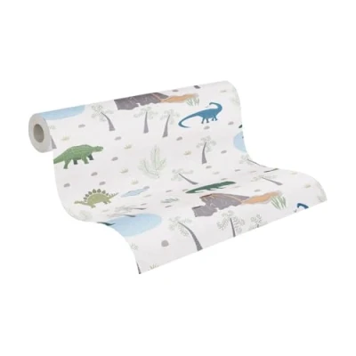 A.S. Création Children's Room Wallpaper Lilly & Luis Solid Non Woven with Dinosaur Design, 10,05 m x 0,53 m, Blue, Multicoloured, Green, Made in Germany, 771401.