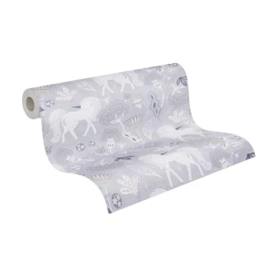 A.S. Création Children's Room Wallpaper Lilly & Luis Solid Non Woven with Unicorn Design, 10,05 m x 0,53 m, Grey, Pink, White, Made in Germany, 771381.