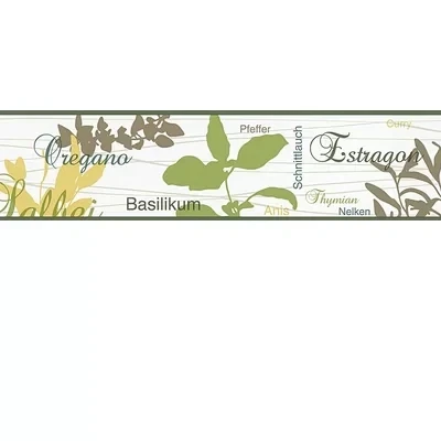 Words relating to herbs are randomly placed across this border in various hues of green. Shown here in the green colourway. Self adhesive border - please request sample for true colour and texture. Pattern repeat is 52cm.