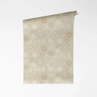 A.S. Création VERSACE VI Art De La Table 791361 Non Woven Wallpaper Baroque Blackboard Motifs, Porcelain Decor with Medusa Head, Vinyl Surface, Wallpaper, Design, 10.05 m x 0.70 m, Beige
