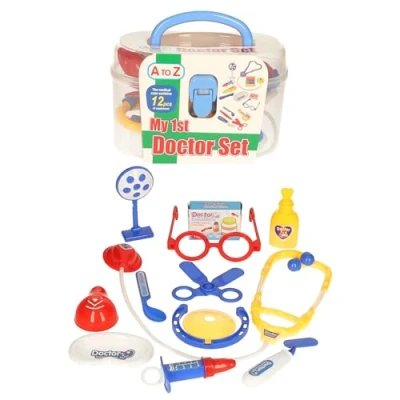 COMPLETE SET: Contains 12 pieces of medical play equipment including stethoscope, glasses, scissors, thermometer, and other essential doctor tools packed in a convenient carrying case EDUCATIONAL VALUE: Perfect for role-play activities that help children develop empathy, communication skills, and understanding of basic medical procedures PORTABLE DESIGN: Transparent carrying case with blue handle makes it easy for children to transport their medical kit and keep all pieces organised DURABLE CONSTRUCTION: Made with sturdy plastic materials in bright, appealing colours that are built to withstand regular play sessions SAFE PLAY: Specially designed with rounded edges and age-appropriate sizes, making it suitable for young children's imaginative play, Manufacturer: Atoz