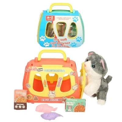 A to Z Pet Play Set with Plush Cat, Carrier House and Pretend Food Accessories, Kids Role Toy