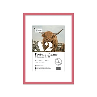 A2 Pink Picture Frame With White Mount for A3 (29.7 x 42cm 11.7 16.5in) Print, Photo, or Poster. Portrait and Horizontal Wall Hooks