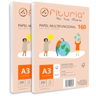 The measurements: The paper pack contains 500 sheets of A3 paper (297 x 420 mm) with a thickness of 160 g/m2 with excellent results in laser printing, inkjet, photocopying and faxing. VARIETY OF USES You can use the A3 sheets in school settings, at home or in the office. Multifunctional paper fits all your needs. Being a larger format allows to carry out larger work and draw plans in architectural studios. The 160g white paper is ideal for writing, drawing or painting with different materials. You can use letterring markers, colored pens or school crayons. Let your imagination run wild with crafting with A3 paper. With Environmental Certificates: The sheets are FSC certified (responsibly managed forests) and are 100% recyclable. 160g white paper More uses of paper: you can also use it as school supplies for fun painting, drawing or writing in workshops, painting schools or plastic classes.
