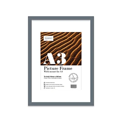A3 Grey Picture Frame With White Mount for A4 (21 x 29.7cm 8.3 11.7in) Print, Photo, or Poster. Portrait and Horizontal Wall Hooks