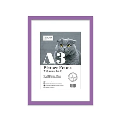 A3 Purple Picture Frame With White Mount for A4 (21 x 29.7cm 8.3 11.7in) Print, Photo, or Poster. Portrait and Horizontal Wall Hooks
