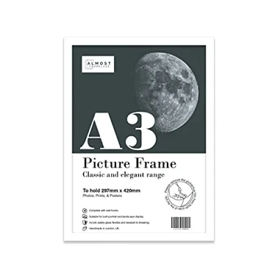 A3 Picture frame to house an A3 sized print - No mount The picture frame moulding is 20mm wide and 16mm deep External frame dimensions are: 33 x 45.2 cm - 13 x 17.8 inchs Fold-out wall hooks for horizontal and vertical wall hanging. Does not come with a kick-stand. Stylish thin White picture frame for an A3 print, poster, or photo