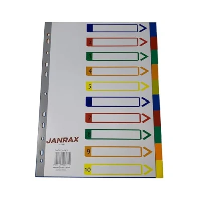 10 Part A4 Polypropylene Dividers with Index Cover by Janrax. Multipunched 120 Micron Hard wearing A4 PP sheet dividers. Assorted colour tabs for quick identification. The front index sheet provides space for labelling to make referencing quick and easy. Made from tear-resistant, wipe clean polypropylene.