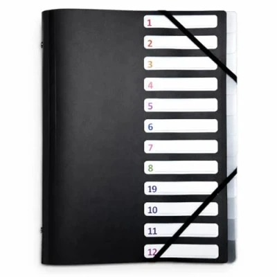 Efficient filing: A4 file folder with 12 dividers. Numbered and customizable compartments to easily organize courses, folders, invoices and administrative documents DURABLE MATERIAL: Made of sturdy black polypropylene, 0.45 mm thick cover ensures excellent hold over time NUMBER AND IDENTIFIABLE COMPARTMENTS: Identify each compartment thanks to the numbering and interchangeable customizable label on the cover SECURE CLOSURE: Strong elastic closure keeps your documents securely in place during transport Practical storage: back cover equipped with 3 integrated flaps to store loose documents