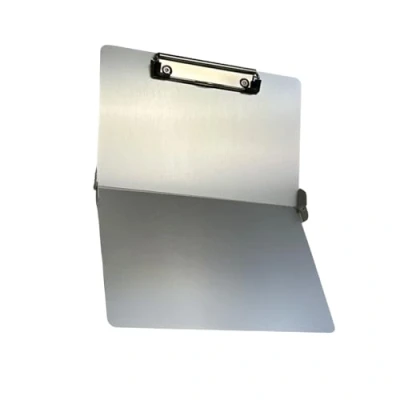 A4 Aluminum Silver Foldable Clipboard. Strong metal clip with black plastic edge to keep documents safe. Folded approx 225x157x12mm. Opens up to hold A4 size documents.