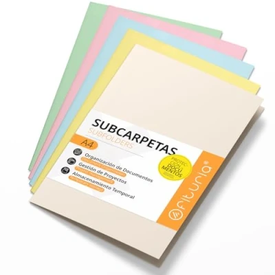 A4 CARDBOARD SUBFOLDERS: the A4 cardboard subfolders (210x297mm) 180g soft assorted colors: ivory, yellow, pink, blue and green. They are ideal for keeping your documents organized inside cardboard folders, file folders, and office filing cabinets, making it easy to sort and quick access to important information. COLOR CLASSIFICATION: Subfolders available in a variety of colors, allow you to easily differentiate between different categories of documents, functioning as classifier folders within your A4 filing folders and portfolios. PROTECTION AND DURABILITY - With a thickness of 180g, these cardstock subfolders offer extra protection to your documents, especially when used as dividers inside A4 folders or cardboard sorter folders. VERSATILITY OF USE - Ideal for use in filing folders and office filing cabinets, these A4 cardstock subfolders are an excellent choice for organizing important documents around the home, such as bills, contracts or school assignments. UNIVERSAL COMPATIBILITY - A4 cardstock subfolders are compatible with any A4 file cabinet or file folder, helping you keep your documents tidy in any folder or file cabinet, both at home and in the office.