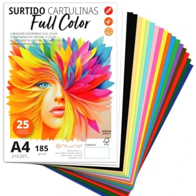 A4 COLOURS CARDBOARD: Assorted Color Card Pack. Pack of 25 Assorted Full Colour Cardstock Includes: 5 x White, 5 x Black, 1 x Cream, 1 x Light Yellow, 1 x Yellow, 1 x Orange, 1 x Pink, 1 x Fuchsia, 1 x Purple, 1 x Light Green, 1 x Green, 1 x Dark Green, 1 x Light Blue, 1 x Navy, 1 x Grey and 1 x Brown. CRAFTS & DESIGN - Assorted A4 coloured cardstock essential as craft material. You can create: personalized cards for birthdays, invitations, thank you or events.Make ornaments for parties, weddings or celebrations.Design origamis. Scrapbooking decoration. Or make creative collages or artistic projects. EDUCATION AND CREATIVITY: A4 assorted coloured cards and white a4 cards are ideal for school activities, as craft supplies, children's papyroflexy or A4 drawing sheets in creative projects. Perfect for developing artistic and motor skills. KEY BENEFITS: Versatility: Can be used in multiple projects.Practicality: Its A4 size is perfect for easy printing, cutting or handling. Aesthetics: Vibrant and varied colors draw attention and highlight projects. IDEAL FOR HOME, OFFICE OR SCHOOL - A4 assorted color card stock is useful for design professionals, students and families looking for colored cardstock or large cardstock for arts, school or branding projects. A staple in any creative kit!