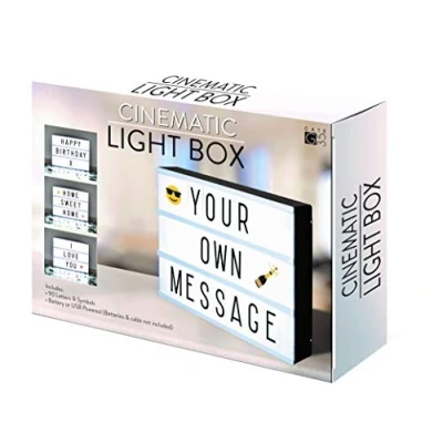Write your own personalised messages - 105 interchangeable letters, numbers and colour emojis (champagne anyone?!) make our Cinematic Light Box with letters fully customisable to suit all moods and occasions. Colour emojis and energy efficient bright white LED lights ensure an even, unwavering glow adding to the atmosphere of any occasion. Perfect for Weddings, Birthdays, Baby Showers and Parties. USB charging cable included or use 3 X AA batteries - Perfectly portable; can be used with either USB charging cable (included) or 3 x AA batteries to take the glow with you wherever you go (batteries not included) Novelty gift - This gorgeous light feature will complement the décor of your home, business or make a fantastic bespoke gift with a message that can be personalised again and again. Easy to use - Simply slide the tiles into the slots on the front to Create your own Personalised Message.