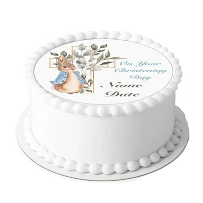 A4 Edible Decor Icing Sheet PERSONALISED Christening Boy 7-8" Circle Cake Topper Decoration - Great for larger cakes This lovely cake topper is printed on an A4 Decor icing sheet with edible inks. THIS IS A PERSONALISED ITEM AND THEREFORE WE WILL NEED YOUR WORDING/MESSAGE SENT TO US IN AN AMAZON MESSAGE ONCE YOU HAVE PLACED YOUR ORDER. You will receive images exactly as shown in the picture and you just simply cut around the circle, peel off the plastic backing and place on top of your iced cake. Fully edible with a shelf life of at least 12 months from purchase if kept dry and in sealed packet. Fully Edible - Fully Edible - Fully Edible - Decor Icing Ingredients -Thickener(E1422,E1412), Maltodextrin, Hunecetant E422, Sugar, Water, Stabilizers(E414,E460i), Dextrose, Emulsifiers (E435, E491,E471), Food Colour, Flavours, Acidity Regulator E330, Preservative E202, Sucralose, Manufacturer: Orange Trading Dartmouth LTD