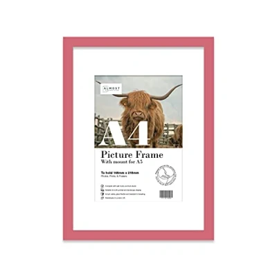 A4 Pink Picture Frame With White Mount for A5 (14.8 x 21cm 5.8 8.3in) Print, Photo, or Poster. Portrait and Horizontal Wall Hooks/kickstand Art Display