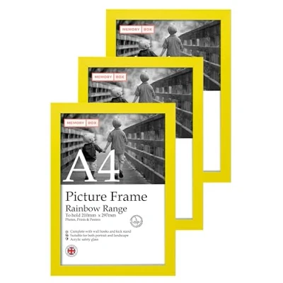 QUALITY: This set of three Yellow A4 picture frames is ideal for displaying your treasured prints, posters, artwork, or photos. With its lightweight and slim-edge design, this frame will elegantly present your artwork. SUSTAINABLE AND DURABLE MATERIALS: Skilfully made by picture frames, these elegant and slim A4 frames feature sustainable Polecore recycled molding and premium Perspex sheets for superior picture viewing. The contemporary Yellow finish and slim-edge design enhance any home or office décor, making them a perfect addition to your gallery wall. SIZE AND ORIENTATION: Our precisely crafted Yellow picture frames are designed to perfectly fit A4 pictures and include fold-out wall hooks for effortless hanging in both landscape and portrait orientations. PERFECT FOR ANY OCCASION: Our set of three Yellow A4 picture frames are an ideal way to showcase your favourite memories, artwork, or achievements. The thin-edge, lightweight design of these frames elevates the artwork they contain, making them a perfect addition to any kitchen, living space, or office. Whether you are treating yourself or gifting a loved one, our frames are guaranteed to add a touch of elegance to any decor. MADE IN THE UK: Our picture frames are meticulously crafted in our Stevenage-based workshop. As a UK-based company, we are dedicated to maintaining the highest quality standards and take pride in ensuring that each frame meets our customers' expectations. With our focus on customer satisfaction and attention to detail, you can trust that you are receiving a product truly worth displaying.