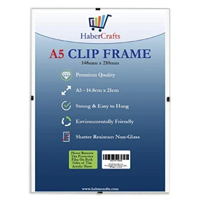 Habercrafts A5 Size Clip Frame Measures 148 x 210mm And Made From Thick 4mm MDF Wooden Backing, Crystal Clear Styrene Glass And Durable Metal Fastening Sleek And Modern Our Clip Frames Will Hold Your Item Safe And Secure With Its Non Glass Break And Shatter Resistant Cover, So You Can Display Your Pictures With A Contemporary Minimalist Design Without Being Distracted From The Photo Our Versatile Frames Have A Wide Range Of Uses From Framing Posters, Photos, Pictures And Comics To Displaying Certificates, Prints, Artwork And Keep Sakes Hang In Both Portrait And Landscape Orientations, These Lightweight, And Contemporary Frames Are Perfect For Home, School, Office, And More. Frames Are Individually Wrapped, Packaged With Protective Corners And A Clear Peel Off Film To Protected Against Scratches, Dirt Or Damage Before Use Available In Sizes A1 (594 x 841mm), A2 (420 x 594mm), A3 (297 x 420mm), A4 (210 x 297mm) & A5 (148 x 210mm) In Packs Of 1 To 24 So You Can Always Get The Best Price No Matter The Size Of Your Project